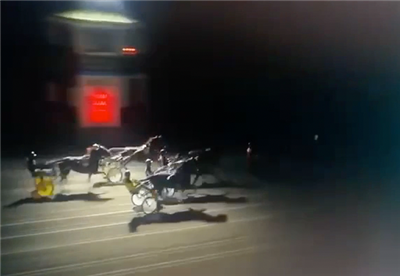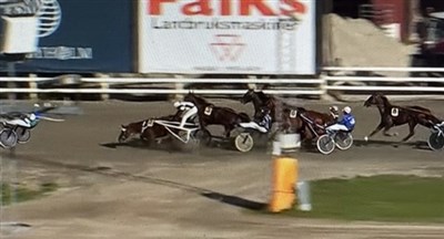 Vad händer när någon hastigt släcker lampan och det blir nattsvart på travbanan? Flera kuskar och hästar kolliderade med varandra, en kusk fördes med ambulans till sjukhus. Minst tre hästar hamnade mitt i smeten och flera kuskar slungades ur sina sulkies. Två hästar fick sårskador, behövde veterinärvård.
