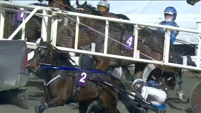 Travhästen Pete Baldwin kröp under startbilsvingen och kusken Thomas Dalborg ”följde som tur var med”! Måste haft änglavakt och extremsnabb reaktionsförmåga. Slängde sig bakåt raklång, tråcklade sig under startbilsvingen utan skador.